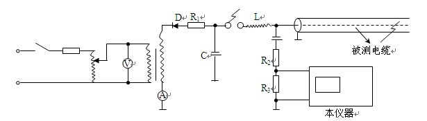 3.按圖所示線路連接設備。地線按要求接好。其中儲能電容C要求大于1μF,耐壓應能滿足試驗要求。其它設備要求與直閃法相同。電感一般取27001中的2或3,也可視被測電纜段的長度或根據(jù)反射波形適當增大或減小。