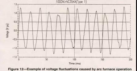 電壓波動(dòng):波動(dòng)幅值不超過(guò)10%的周期性電壓變動(dòng)。 通常,這個(gè)變化值遠(yuǎn)小于大部分電氣設(shè)備敏感限制,因此只在少數(shù)情況下才會(huì)發(fā)生運(yùn)行上的問(wèn)題。引起電壓波動(dòng)的主要原因是功率沖擊性波動(dòng)負(fù)荷。(下圖為電弧爐引起電壓波動(dòng))