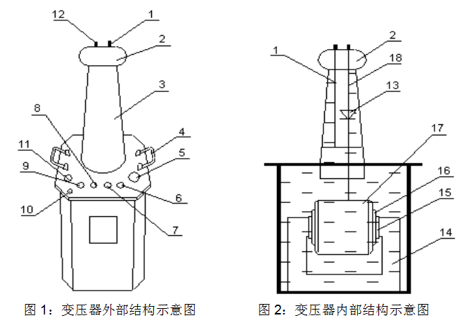 本系列產(chǎn)品鐵芯為單相芯式,采用優(yōu)質(zhì)冷軋取向硅鋼片疊制而成,緊固方式采用鋼材作夾件。高壓線圈為圓筒多層塔式,由優(yōu)質(zhì)聚酯漆包線及高耐壓值絕緣材料繞制而成。低壓線圈在外,儀表線圈為一獨(dú)立繞組,一般情況下為100V。殼體為八角形,10kVA以上的油浸式試驗(yàn)變壓器裝有可移動(dòng)的鐵輪。具有重量輕、體積小、移動(dòng)方便、性能優(yōu)越等特點(diǎn)。其外部結(jié)構(gòu)圖見(jiàn)圖1,內(nèi)部結(jié)構(gòu)圖見(jiàn)圖2。