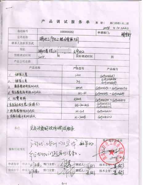 2014-11-04 湖北三寧化工股份有限公司進行調(diào)試服務,調(diào)試產(chǎn)品: