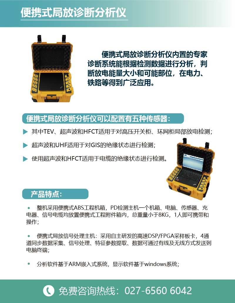 整機(jī)采用便攜式ABS工程機(jī)箱,PD檢測主機(jī)一個機(jī)箱、電腦、傳感器、充電器、信號電纜均放置便攜式工程附件箱內(nèi),總重量小于8KG,1人即可攜帶和操作